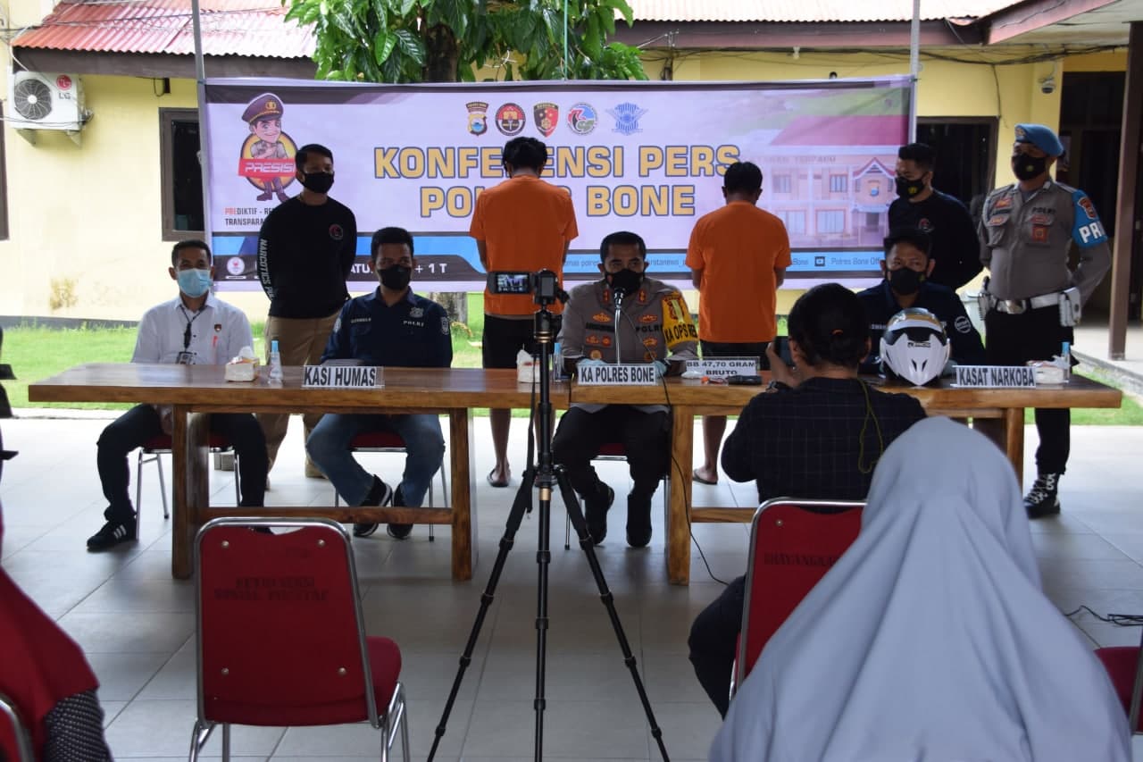 Kapolres Bone yang didampingi oleh Kasat Narkoba Iptu Aswan,S.H. bersama Kasubsi PIDM Sihumas dan Kaur Bin Ops Satnarkoba Ipda Sudirman,S.H. dalam acara Press Relese yang digelar di Aula Terbuka Polres Bone menjelaskan bahwa barang bukti seberat itu berhasil didapatkan dari dua pria berinisial ER dan DS.