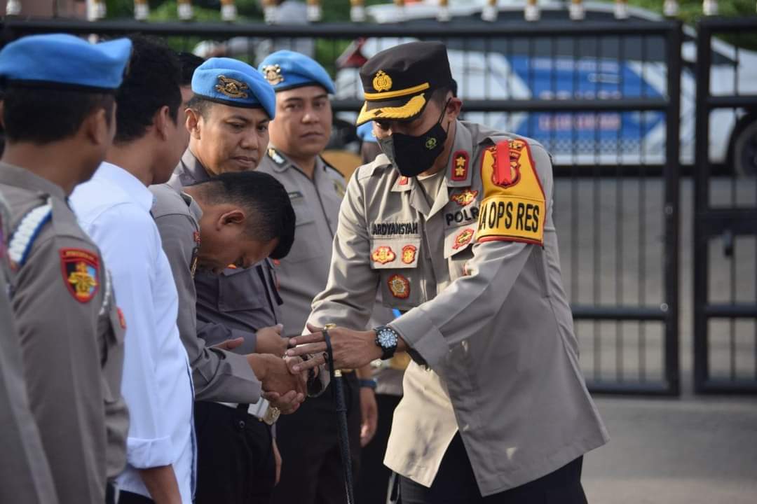 Apel pagi selesai, Kapolres langsung mendatangi satu persatu personel untuk salaman pamit diri yang selanjutnya akan persiapan berangkat ke Makassar dalam rangka serah terima jabatan.
