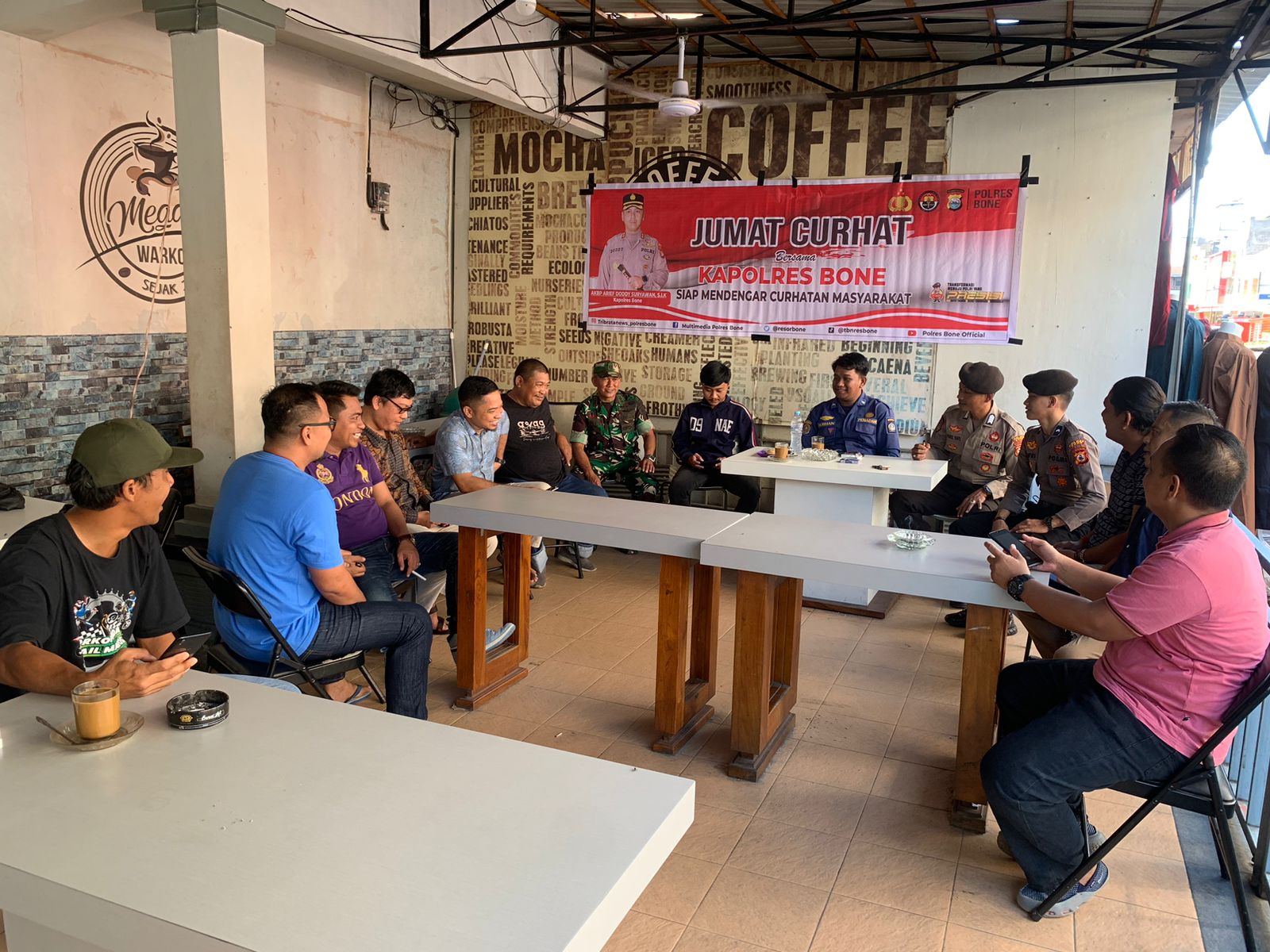 Jum’at Curhat merupakan agenda rutin pimpinan kepolisian kembali digelar di Café Megazone Jalan KH. Agussalim Kota Watampone di koordinir langsung Kanit 1 Sat Intelkam Aiptu Rudi Ardi. Jum’at 28/04/2023.