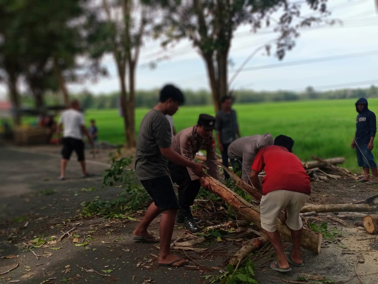 Gotong Royong, Bhabinkamtibmas Bersama Warga Lakukan Penebangan Pohon yang Mengangu Akses Jalan