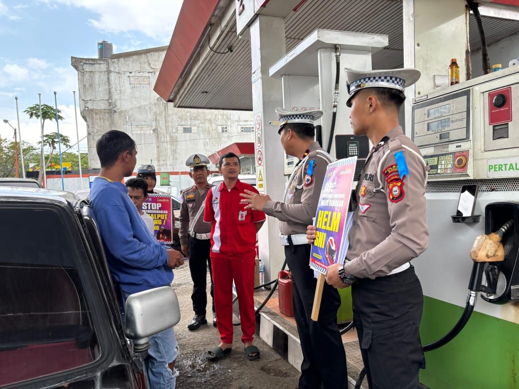 KBO Satlantas Polres Bone Ipda Lukman didampingi Kanit Kamsel Ipda Sasram bersama anggotanya melakukan sosialisasi Ops Keselamatan terhadap masyarakat di SPBU Jalan Agussalim, Kabupaten Bone.
