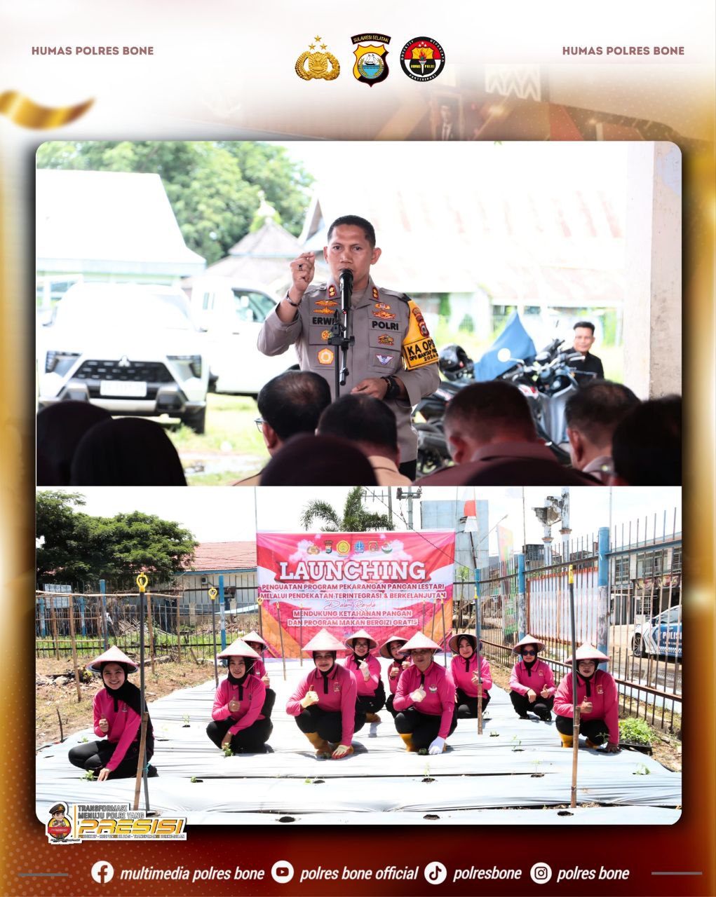BONE – Kapolres Bone AKBP Erwin Syah,S.I.K,.M.H bersama Ketua Bhayangkari Cabang Bone Ny.Siska Erwin Syah launching Penguatan Program Pekarangan Pangan Lestari melalui pendekatan terintegrasi dan berkelanjutan dalam rangka mendukung program ketahanan pangan dan program makan bergizi gratis.