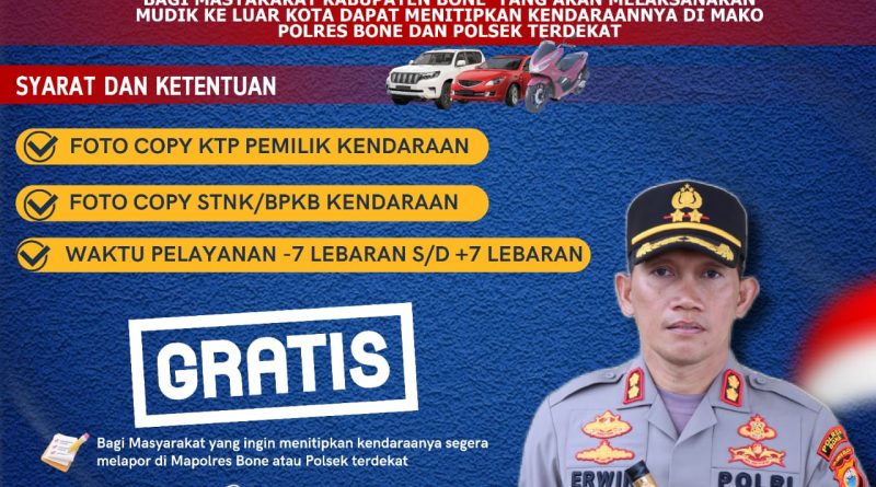 BONE – Menjelang hari raya Idul Fitri 1446 H tahun 2025, Polres Bone membuka layanan penitipan barang berharga dan kendaraan bagi masyarakat yang akan mudik ke luar daerah.