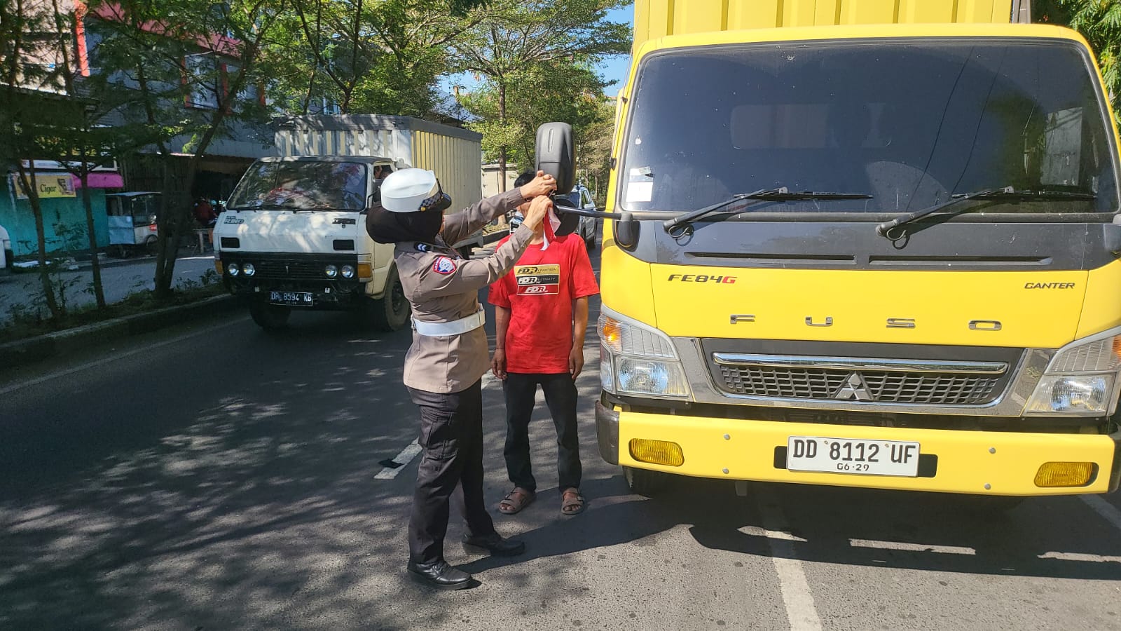 Personel Ditlantas Polda Sulsel membagikan Bendera Merah Putih kepada para pengguna jalan yang melintas. Sasaran kegiatan meliputi mobil angkutan umum, kendaraan pribadi, dan truk yang melintasi wilayah hukum Polda Sulsel. Selain itu, petugas juga memberikan imbauan kepada masyarakat untuk selalu tertib dan mematuhi aturan berlalu lintas.