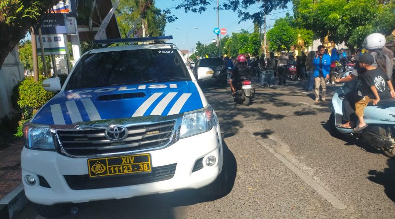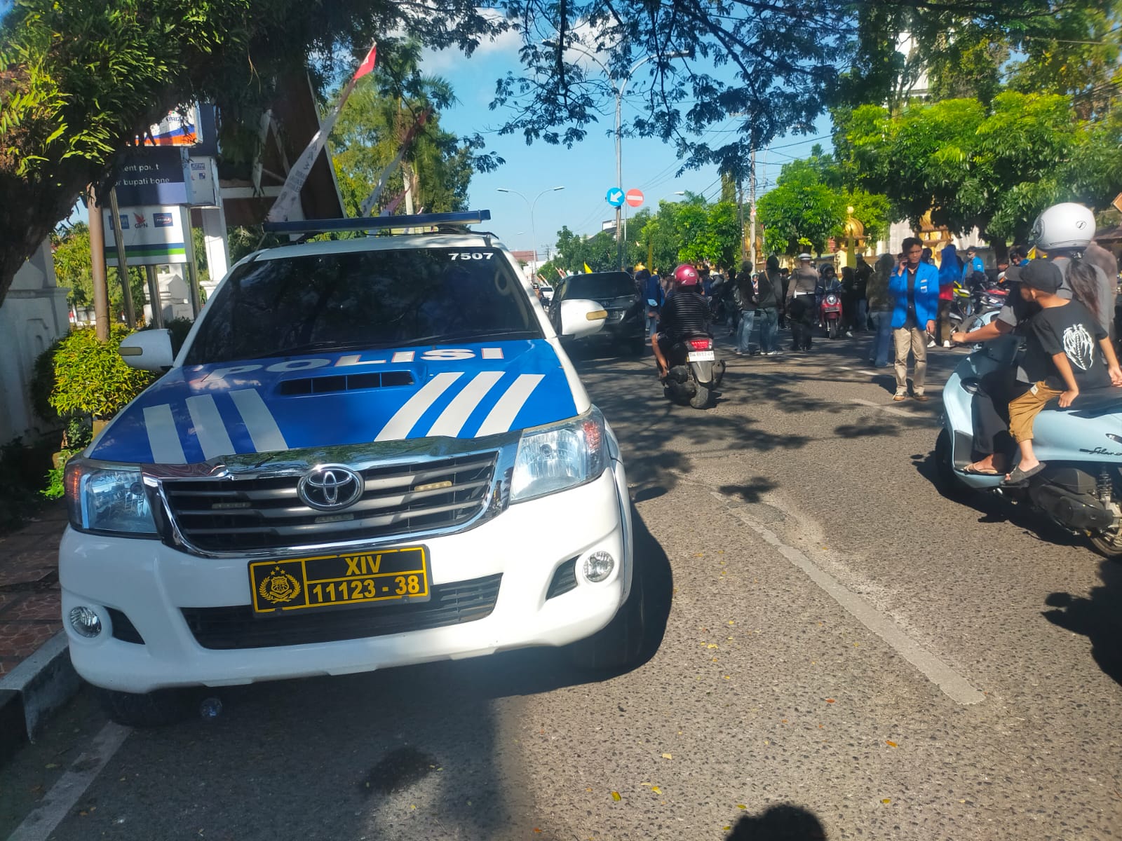 BONE – Satuan Lalu Lintas (Satlantas) Polres Bone melakukan pengawalan dan pengamanan aksi unjuk rasa damai yang dilakukan oleh PMII Bone dan HMI Bone bertempat di Kantor DPRD Bone Jl Reformasi dan Kantor Bupati Bone, Jl Jend Ahmad Yani, Selasa (12/8/2025).