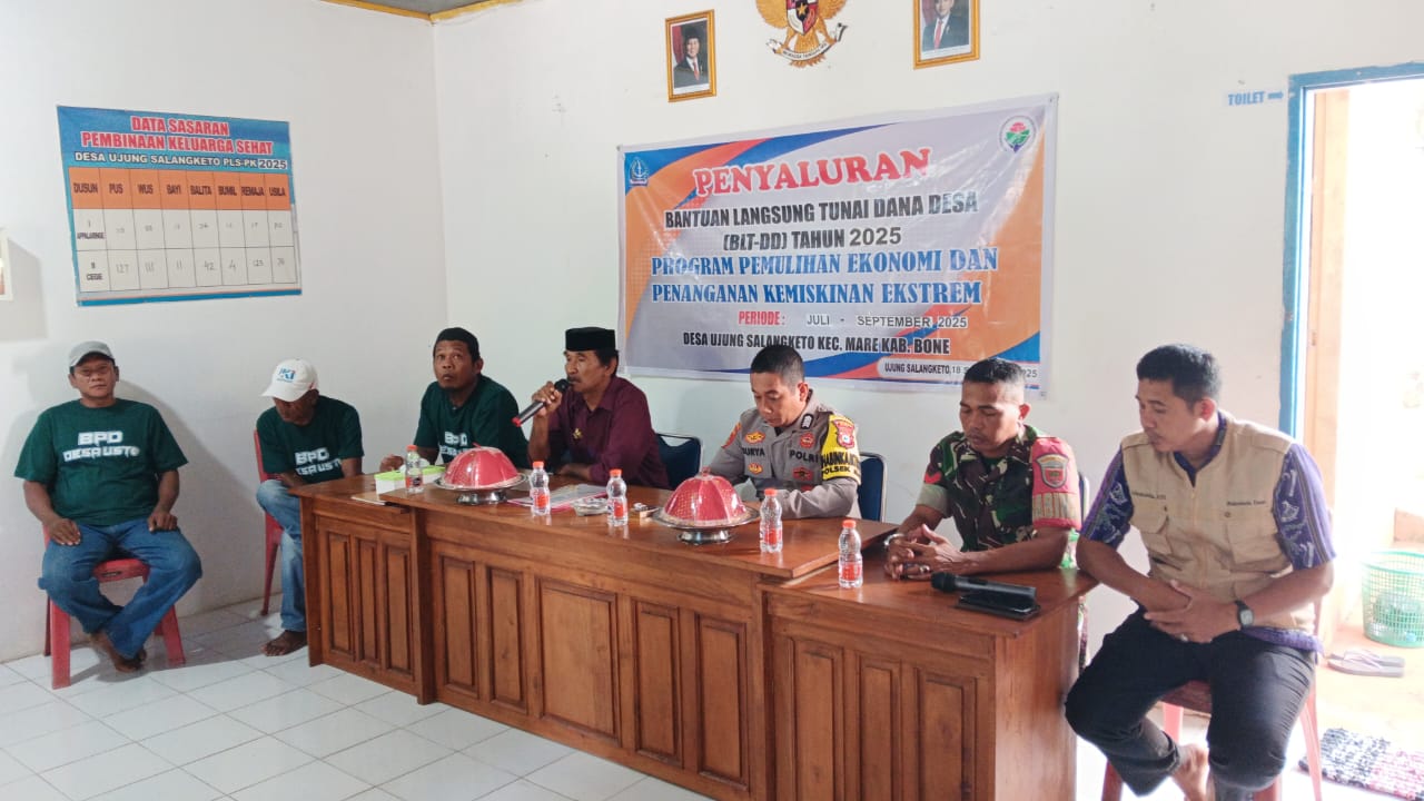 BONE – Wujud sinergitas TNI-Polri dalam mendukung program pemerintah terlihat saat Bhabinkamtibmas Polsek Mare Bripka Surya Sukma bersama Babinsa Koramil Mare Koptu Rahman kompak menghadiri kegiatan penyaluran Bantuan Langsung Tunai Dana Desa (BLT-DD) kepada warga masyarakat yang bertempat di kantor desa Usto Kecamatan Mare Kabupaten Bone, pada Kamis (18/09/2025).