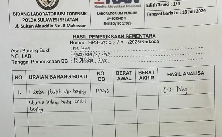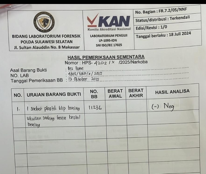 Barang bukti berupa sachet kristal bening yang diduga narkotika jenis sabu kemudian dikirim untuk diuji di Laboratorium Forensik Polda Sulawesi Selatan. Setelah beberapa hari menunggu, hasil pemeriksaan laboratorium mengejutkan.