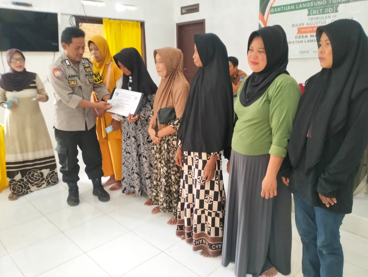 Lamuru-Bone Bhabinkamtibmas Polsek Lamuru, Brigpol Ardian Anas, menghadiri kegiatan Penyaluran Bantuan Langsung Tunai Dana Desa (BLT-DD) Tahap III periode Agustus sampai dengan Oktober 2025 yang dilaksanakan di Aula Kantor Desa Maminasae, Kecamatan Lamuru, Kabupaten Bone, Selasa (04/11/2025).