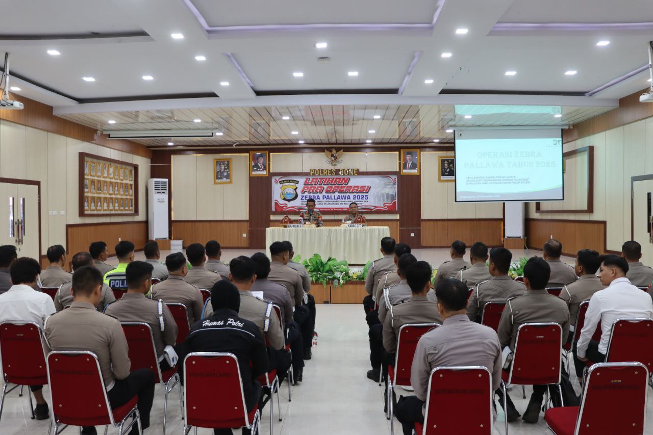 Watampone – Polres Bone Polda Sulsel melaksanakan Latihan Pra Operasi (Latpraops) Zebra Pallawa 2025 dengan tema “Terwujudnya Kamseltibcarlantas yang aman, nyaman dan selamat menjelang pelaksanaan Operasi Lilin 2025”. Kegiatan tersebut digelar pada Senin, 17 November 2025, bertempat di Aula Sarja Arya Racana Mapolres Bone.