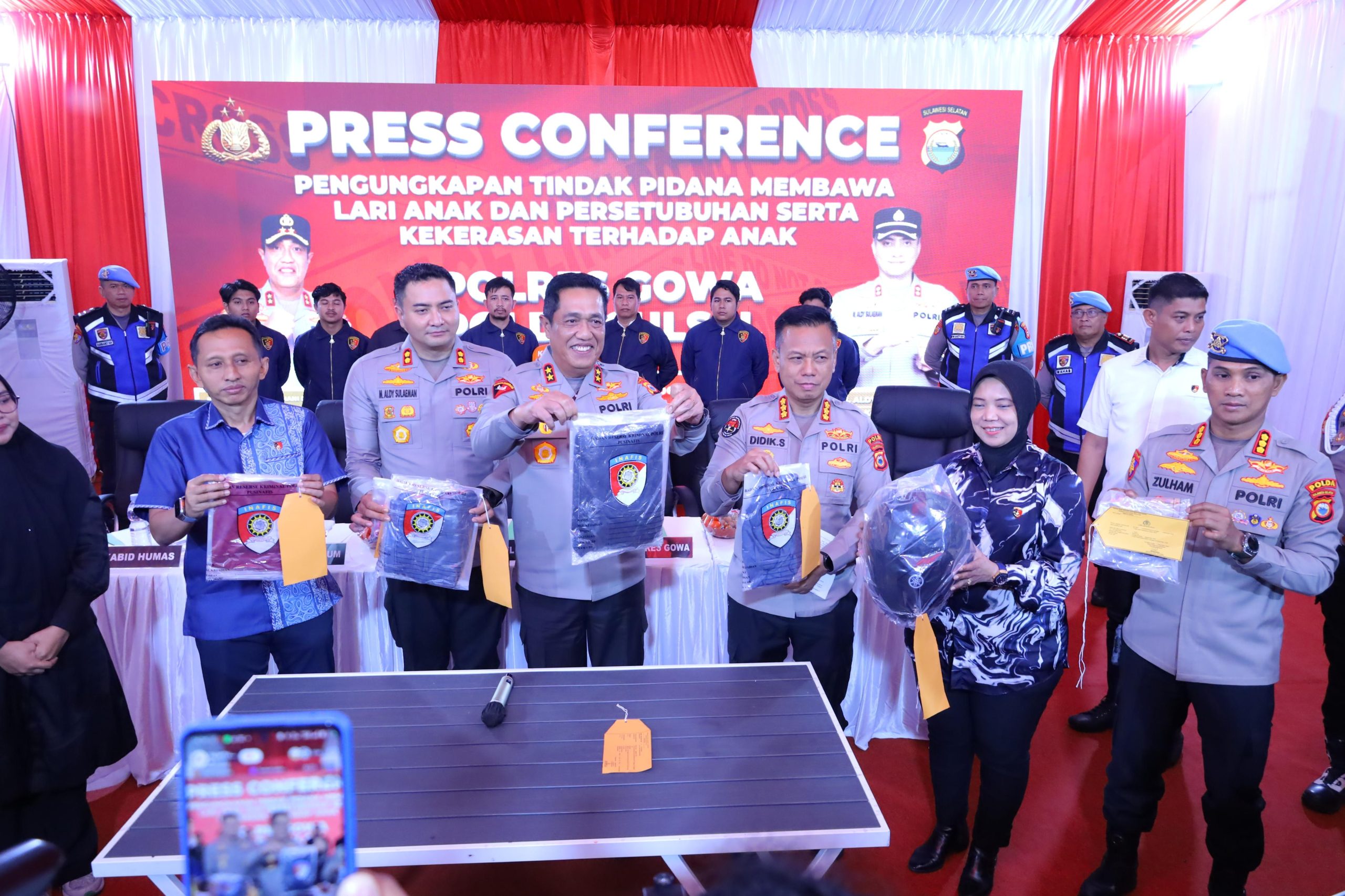 Kapolda Sulawesi Selatan Irjen Pol. Djuhandhani Rahardjo Puro, S.H., M.H., memimpin Press Conference pengungkapan tindak pidana membawa lari anak, persetubuhan dan/atau perbuatan cabul terhadap anak, serta kekerasan di Mapolres Gowa, Selasa (09/12/2025).