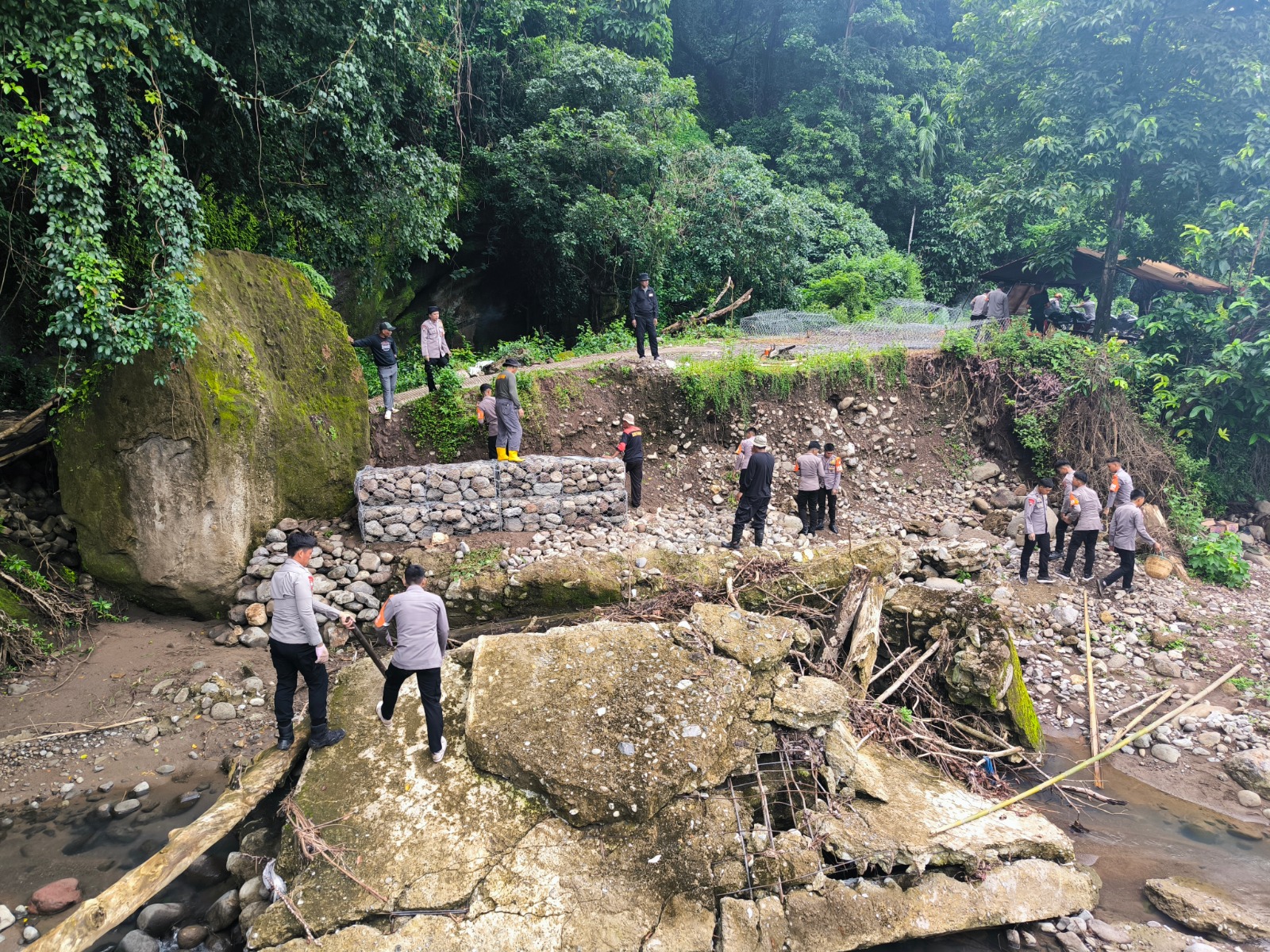 Personel Batalyon B Pelopor Satuan Brimob Polda Sulawesi Selatan melaksanakan pembangunan jembatan darurat di Dusun Pakka, Desa Nepo, Kecamatan Mallusetasi, Kabupaten Barru, Selasa (13/01/2026). Kegiatan ini merupakan bentuk nyata kepedulian Polri terhadap kebutuhan masyarakat, khususnya akses transportasi yang aman dan layak.