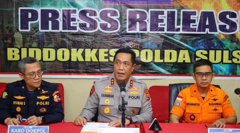 Konferensi pers dipimpin langsung oleh Kapolda Sulawesi Selatan Irjen Pol. Djuhandhani Rahardjo Puro, S.H., M.H., didampingi Karo Dokpol Pusdokkes Polri Brigjen Pol. dr. A. Nyoman Eddy Purnama Wirawan, DFM., Sp.F, Direktur Operasi Basarnas Laksamana Pertama TNI Yudhi Bramantyo, N.S., M.TR., Opsla, serta Kapusident Bareskrim Polri Brigjen Pol. Mashudi, S.I.K., S.H., M.Hum., Kabiddokkes Polda Sulsel Kombes Pol. dr. Muhammad Haris, M.A.R.S., QHIA.