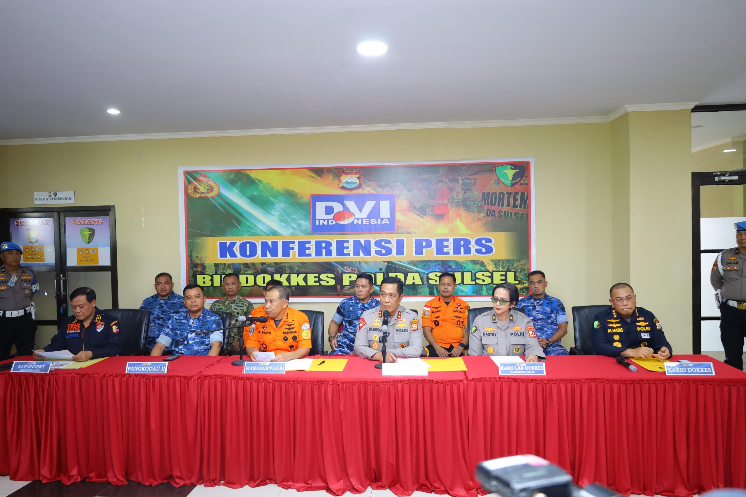 Penyerahan tersebut disampaikan dalam Konferensi Pers yang digelar di Biddokkes Polda Sulsel. Kegiatan dipimpin langsung oleh Kepala Basarnas RI Marsekal Madya TNI Mohammad Syafii, didampingi Kapolda Sulawesi Selatan Irjen Pol. Djuhandhani Rahardjo Puro, S.H., M.H., Pangkodau II Marsekal Muda TNI M. Untung Suropati, Kapusident Bareskrim Polri Brigjen Pol. Mashudi, Karo Labdokkes Pusdokkes Polri Brigjen Pol. dr. Sumy Hastry Purwanti, DFM, Sp.F, serta Kabiddokkes Polda Sulsel Kombes Pol. dr. Muhammad Haris.