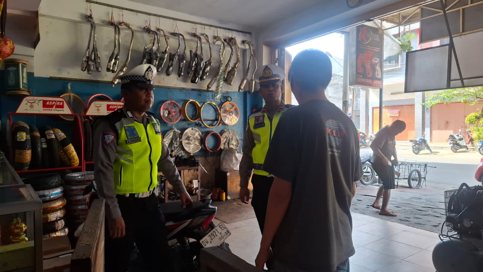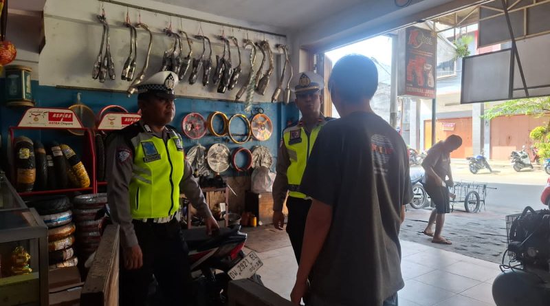 Unit Kamsel Satlantas Polres Bone memberikan imbauan dan sosialisasi kepada pemilik bengkel Toko Sentral Jaya Jalan Sukawati.