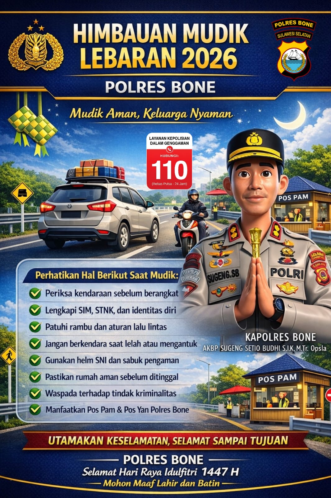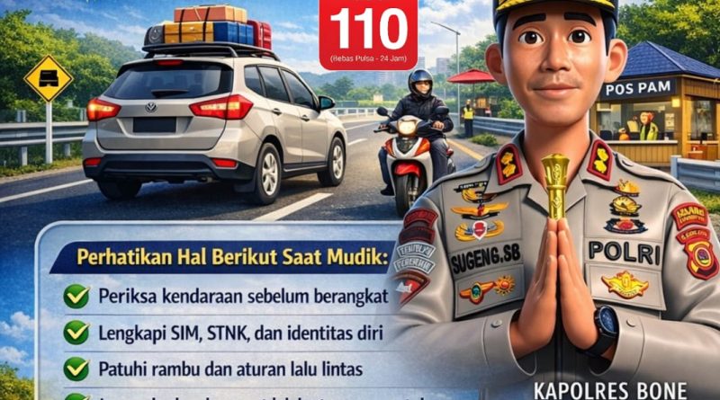 Bone – Menjelang arus mudik Hari Raya Idul Fitri 1447 H/2026 M, Polres Bone Polda Sulawesi Selatan mengimbau masyarakat yang akan melakukan perjalanan mudik agar selalu mengutamakan keselamatan, mematuhi aturan lalu lintas, serta memanfaatkan layanan kepolisian yang tersedia selama periode mudik.